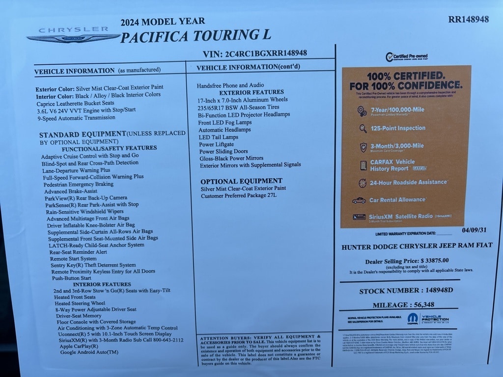 CARFAX One-Owner. 19/28 City/Highway MPG Silver Mist Clearcoat 2024 Chrysler Pacifica Touring L FWD 9-Speed 948TE Automatic 3.6L V6 24V VVT 10.1" Touchscreen Display, 17" x 7.0" Aluminum Wheels, 3.25 Axle Ratio, 3rd row seats: split-bench, 4-Wheel Disc Brakes, 6 Speakers, ABS brakes, Air Conditioning, Alloy wheels, AM/FM radio: SiriusXM, Apple CarPlay, Apple CarPlay/Android Auto, Automatic temperature control, Black Seats, Brake assist, Bumpers: body-color, Caprice Leatherette Bucket Seats, Compass, Delay-off headlights, Disassociated Touchscreen Display, Driver door bin, Driver vanity mirror, Driver's Seat Mounted Armrest, Dual front impact airbags, Dual front side impact airbags, Electronic Stability Control, Four wheel independent suspension, Front anti-roll bar, Front Bucket Seats, Front dual zone A/C, Front fog lights, Front reading lights, Fully automatic headlights, Google Android Auto, GPS Antenna Input, Heated door mirrors, Heated front seats, Heated steering wheel, Illuminated entry, Integrated Active Noise Cancellation, Integrated Center Stack Radio, Knee airbag, Low tire pressure warning, Manufacturer's Statement of Origin, Memory seat, Occupant sensing airbag, Outside temperature display, Overhead airbag, Overhead console, Panic alarm, ParkView Rear Back-Up Camera, Passenger door bin, Passenger seat mounted armrest, Passenger vanity mirror, Power door mirrors, Power driver seat, Power Liftgate, Power steering, Power windows, Quick Order Package 27L, Radio data system, Radio: Uconnect 5 w/10.1" Display, Rain sensing wipers, Rear air conditioning, Rear reading lights, Rear window defroster, Rear window wiper, Reclining 3rd row seat, Remote keyless entry, Security system, Speed control, Split folding rear seat, Spoiler, Steering wheel mounted audio controls, Tachometer, Telescoping steering wheel, Tilt steering wheel, Touring Suspension, Traction control, Trip computer, Turn signal indicator mirrors, USB Host Flip, Variably intermittent wipers, Voltmeter.