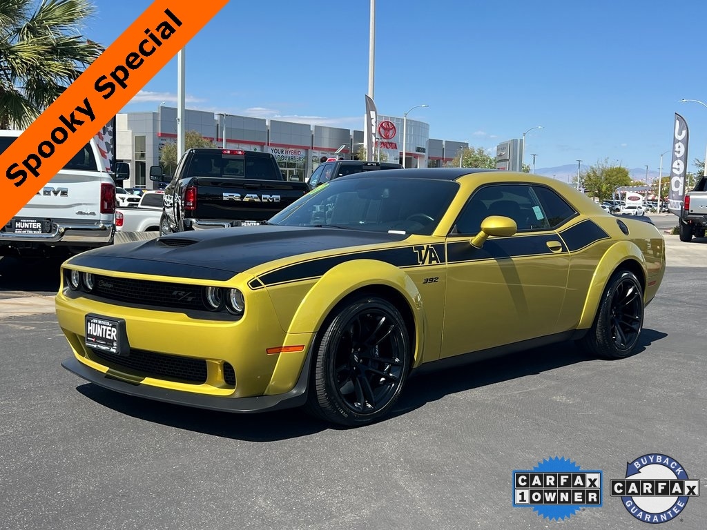 CARFAX One-Owner. Gold Rush 2021 Dodge Challenger R/T Scat Pack Widebody RWD 8-Speed Automatic SRT HEMI 6.4L V8 MDS 1-Yr SiriusXM Guardian Trial, 230MM Rear Axle, 3.09 Rear Axle Ratio, 392 Fender Decal, 4-Wheel Disc Brakes, 506 Watt Amplifier, 6 Speakers, 9 Amplified Speakers w/Subwoofer, ABS brakes, Adaptive Damping Suspension, Air Conditioning, Alloy wheels, Alpine Audio Group w/Subwoofer, AM/FM radio: SiriusXM, Anti-whiplash front head restraints, Apple CarPlay, Apple CarPlay/Android Auto, Auto-dimming Rear-View mirror, Automatic temperature control, Black Satin Painted Hood, Brake assist, Brembo 6-Pot Fixed Front Caliper Brakes, Bumpers: body-color, Compass, Delay-off headlights, Driver door bin, Driver vanity mirror, Dual front impact airbags, Dual front side impact airbags, Electronic Stability Control, Emergency communication system: SiriusXM Guardian, Flat-Bottom Steering Wheel, Four wheel independent suspension, Front anti-roll bar, Front Bucket Seats, Front Center Armrest, Front dual zone A/C, Front fog lights, Front License Plate Bracket, Front reading lights, Fully automatic headlights, Functional Hood Scoop, Garage door transmitter, Gloss Black I/P Cluster Trim Rings, Google Android Auto, GPS Antenna Input, Heated door mirrors, Heated front seats, Heated steering wheel, Houndstooth Cloth Performance Seats, Illuminated Air-Catcher Headlamps, Illuminated entry, Integrated Center Stack Radio, Integrated Voice Command w/Bluetooth, Leather Shift Knob, Low tire pressure warning, Media Hub (2 USB, AUX), MOPAR Cold Air Intake System, Outside temperature display, Overhead airbag, Overhead console, Panic alarm, ParkView Rear Back-Up Camera, Passenger door bin, Passenger vanity mirror, Performance Shift Indicator, Power door mirrors, Power driver seat, Power steering, Power windows, Quick Order Package 24N R/T Scat Pack Widebody, Radio data system, Radio: Uconnect 4C w/8.4" Display, Rear anti-roll bar, Rear reading lights, Rear seat center armrest, Rear window defroster, Remote keyless entry, Rhombi 2-Pc Wheel Center Cap, Satin Wrap Roof/Decklid, Scat Pack Logo Houndstooth Seat, Security system, Shark Fin Antenna, SiriusXM Satellite Radio, Speed control, Speed-sensing steering, Split folding rear seat, Spoiler, Sport steering wheel, Steering wheel mounted audio controls, Surround Sound, T/A Bodyside Graphic, T/A Package, T/A Spoiler Decal, Tachometer, Telescoping steering wheel, Tilt steering wheel, Traction control, Trip computer, USB Host Flip, Variably intermittent wipers, Wheels: 20" x 11.0" Devil's Rim Aluminum, Wheels: 20" x 11" Carbon Black Aluminum, Wheels: 20" x 9" Lo Gloss Granite Crystal, White Face Instrument Cluster, Widebody Competition Suspension, Widebody Fender Flares.