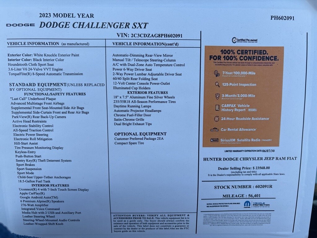 CARFAX One-Owner. Priced below KBB Fair Purchase Price! 19/30 City/Highway MPG White Knuckle Clearcoat 2023 Dodge Challenger SXT RWD 8-Speed Automatic 3.6L V6 24V VVT 276 Watt Amplifier, 4-Wheel Disc Brakes, 6 Speakers, ABS brakes, Air Conditioning, Alloy wheels, AM/FM radio, Anti-Lock Brakes, Anti-whiplash front head restraints, Apple CarPlay, Apple CarPlay/Android Auto, Auto Leather Wrapped Shift Knob, Auto-dimming Rear-View mirror, Automatic temperature control, AutoStick Automatic Transmission, Body Color Exterior Mirrors, Brake assist, Bumpers: body-color, Delay-off headlights, Driver door bin, Driver vanity mirror, Dual front impact airbags, Dual front side impact airbags, Electronic Stability Control, Exterior Mirrors w/Heating Element, For More Info, Call 800-643-2112, Four wheel independent suspension, Front anti-roll bar, Front Bucket Seats, Front Center Armrest, Front dual zone A/C, Front License Plate Bracket, Front reading lights, Fully automatic headlights, Google Android Auto, GPS Antenna Input, Heated door mirrors, Houndstooth Cloth Sport Seat, Illuminated entry, Integrated Center Stack Radio, Integrated Voice Command w/Bluetooth, Leather Shift Knob, Low tire pressure warning, Manuf Statement of Origin, Media Hub (2 USB, AUX), Outside temperature display, Overhead airbag, Overhead console, Panic alarm, ParkView Rear Back-Up Camera, Passenger door bin, Passenger vanity mirror, Power door mirrors, Power driver seat, Power steering, Power windows, Quick Order Package 2EA, Radio data system, Radio: Uconnect 4 w/7" Display, Rear anti-roll bar, Rear reading lights, Rear seat center armrest, Rear window defroster, Remote keyless entry, Security system, SiriusXM Radio Service, SiriusXM Satellite Radio, Speed control, Speed-sensing steering, Split folding rear seat, Spoiler, Steering wheel mounted audio controls, Tachometer, Telescoping steering wheel, Tilt steering wheel, Tip Start, Traction control, Trip computer, USB Host Flip, Variably intermittent wipers, Wheels: 18" x 7.5" Aluminum Fine Silver. Clean CARFAX.