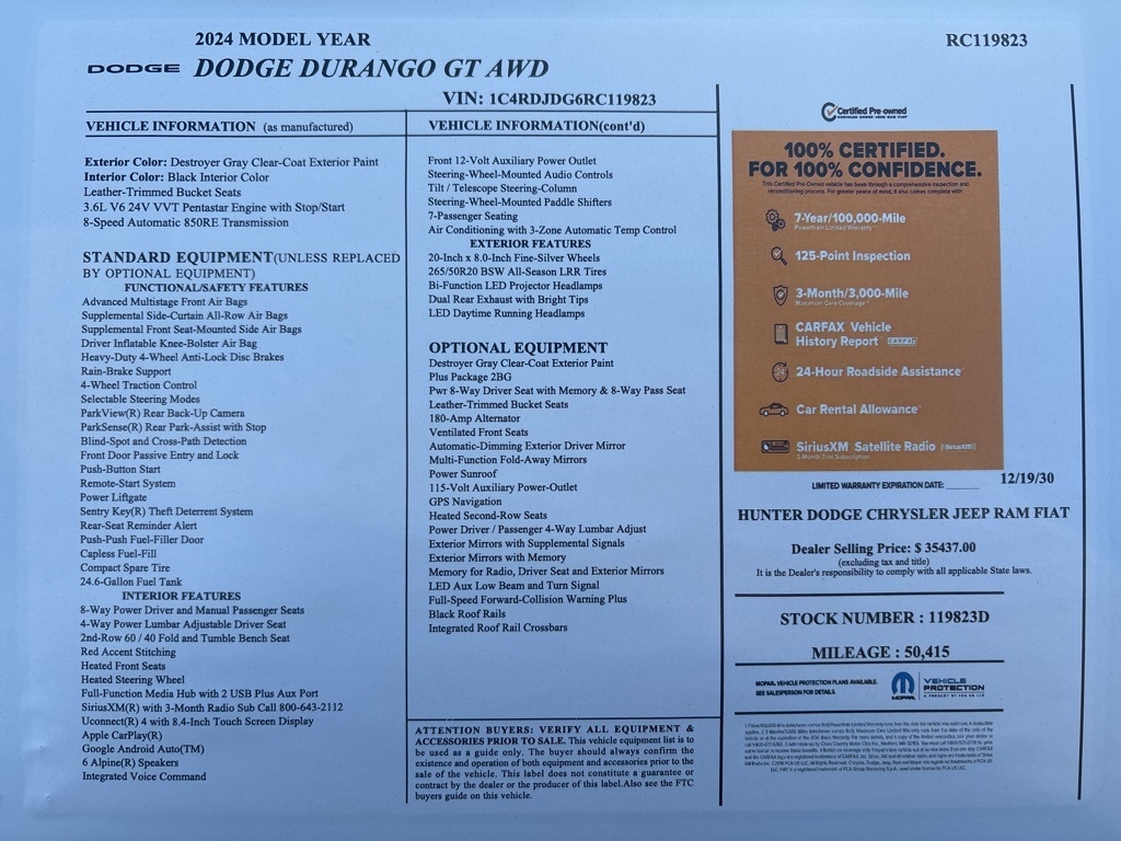 CARFAX One-Owner. Odometer is 1990 miles below market average! Destroyer Gray Clearcoat 2024 Dodge Durango GT Plus AWD 8-Speed Automatic 3.6L V6 24V VVT AWD, 1-Year Trial (Registration Required), 10.1" Touchscreen Display, 115V Auxiliary Power Outlet, 180 Amp Alternator, 3.45 Rear Axle Ratio, 3rd row seats: split-bench, 4-Wheel Disc Brakes, 4G LTE Wi-Fi Hot Spot, 6 Speakers, 7 & 4 Pin Wiring Harness, ABS brakes, Adaptive Cruise Control w/Stop, Air Conditioning, Alloy wheels, AM/FM radio: SiriusXM, Apple CarPlay, Apple CarPlay/Android Auto, Auto-Dimming Exterior Driver Mirror, Auto-dimming Rear-View mirror, Automatic temperature control, Black Roof Rails, Blind Spot w/Trailer Detection, Brake assist, Bumpers: body-color, Class IV Receiver Hitch, Cloth Bucket Seats w/Shift Insert, Compass, Connected Travel & Traffic Services, Delay-off headlights, Disassociated Touchscreen Display, Driver door bin, Driver vanity mirror, Dual front impact airbags, Dual front side impact airbags, Dual Remote USB Port - Charge Only, Electronic Stability Control, Exterior Mirrors w/Heating Element, Exterior Mirrors w/Memory, Exterior Mirrors w/Supplemental Signals, Floor Console w/Leather Armrest, For Details Visit DriveUconnect.com, Four wheel independent suspension, Front anti-roll bar, Front Bucket Seats, Front Center Armrest w/Storage, Front dual zone A/C, Front License Plate Bracket, Front reading lights, Full Speed Forward Collision Warning Plus, Fully automatic headlights, Garage door transmitter, Global Telematics Box Module (TBM), Gloss Black Exterior Mirrors, Google Android Auto, GPS Antenna Input, GPS Navigation, HD Radio, Heated door mirrors, Heated front seats, Heated Second Row Seats, Heated steering wheel, Heavy-Duty Engine Cooling, Illuminated entry, Integrated Center Stack Radio, Integrated Roof Rail Crossbars, Integrated Voice Command w/Bluetooth, Knee airbag, Leather steering wheel, Leather Trimmed Bucket Seats, Leather Wrapped Door Panels, LED Auxiliary Low Beam & Turn Signal, Low tire pressure warning, Occupant sensing airbag, Outside temperature display, Overhead airbag, Overhead console, Panic alarm, ParkView Rear Back-Up Camera, Passenger door bin, Passenger vanity mirror, Power 6x9 Multi-Function Foldaway Mirrors, Power 8-Way Driver Memory 8-Way Passenger Seats, Power door mirrors, Power driver seat, Power Driver/Passenger 4-Way Lumbar Adjust, Power Liftgate, Power steering, Power Sunroof, Power Tilt & Telescopic Steering Column, Power windows, Quick Order Package 2BG GT Plus, Radio data system, Radio: Uconnect 4 w/8.4" Display, Radio: Uconnect 5 Nav w/10.1" Display, Radio/Driver Seat/Mirrors Memory, Rear air conditioning, Rear anti-roll bar, Rear Load Leveling Suspension, Rear reading lights, Rear seat center armrest, Rear window defroster, Rear window wiper, Red Accent Stitching, Remote keyless entry, SiriusXM Guardian - Included Trial (B), SiriusXM w/360L, Speed control, Speed-sensing steering, Speed-Sensitive Wipers, Split folding rear seat, Spoiler, Sport steering wheel, Steering wheel mounted audio controls, Tachometer, Telescoping steering wheel, Tilt steering wheel, Traction control, Trailer Brake Control, Trip computer, USB Host Flip, Variably intermittent wipers, Ventilated Front Seats, Voltmeter, Wheels: 20" x 8.0" Fine Silver, AWD. Clean CARFAX.