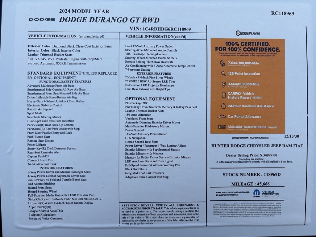 CARFAX One-Owner. Odometer is 7166 miles below market average! 19/26 City/Highway MPG DB Black Crystal Clearcoat 2024 Dodge Durango GT Plus RWD 8-Speed Automatic 3.6L V6 24V VVT 1-Year Trial (Registration Required), 10.1" Touchscreen Display, 115V Auxiliary Power Outlet, 180 Amp Alternator, 3.27 Rear Axle Ratio, 3rd row seats: split-bench, 4-Wheel Disc Brakes, 4G LTE Wi-Fi Hot Spot, 6 Speakers, 7 & 4 Pin Wiring Harness, ABS brakes, Adaptive Cruise Control w/Stop, Air Conditioning, Alloy wheels, AM/FM radio: SiriusXM, Apple CarPlay, Apple CarPlay/Android Auto, Auto-Dimming Exterior Driver Mirror, Auto-dimming Rear-View mirror, Auto-leveling suspension, Automatic temperature control, Black Roof Rails, Blind Spot w/Trailer Detection, Brake assist, Bumpers: body-color, Class IV Receiver Hitch, Cloth Bucket Seats w/Shift Insert, Compass, Connected Travel & Traffic Services, Delay-off headlights, Disassociated Touchscreen Display, Driver door bin, Driver vanity mirror, Dual front impact airbags, Dual front side impact airbags, Dual Remote USB Port - Charge Only, Electronic Stability Control, Exterior Mirrors w/Heating Element, Exterior Mirrors w/Memory, Exterior Mirrors w/Supplemental Signals, Floor Console w/Leather Armrest, For Details, Visit DriveUconnect.com, Four wheel independent suspension, Front anti-roll bar, Front Bucket Seats, Front Center Armrest w/Storage, Front dual zone A/C, Front License Plate Bracket, Front reading lights, Full Speed Forward Collision Warning Plus, Fully automatic headlights, Garage door transmitter, Global Telematics Box Module (TBM), Gloss Black Exterior Mirrors, Google Android Auto, GPS Antenna Input, GPS Navigation, HD Radio, Heated door mirrors, Heated front seats, Heated Second Row Seats, Heated steering wheel, Heavy-Duty Engine Cooling, Illuminated entry, Integrated Center Stack Radio, Integrated Roof Rail Crossbars, Integrated Voice Command w/Bluetooth, Knee airbag, Leather steering wheel, Leather Trimmed Bucket Seats, Leather Wrapped Door Panels, LED Auxiliary Low Beam & Turn Signal, Low tire pressure warning, Occupant sensing airbag, Outside temperature display, Overhead airbag, Overhead console, Panic alarm, ParkView Rear Back-Up Camera, Passenger door bin, Passenger vanity mirror, Power 6x9 Multi-Function Foldaway Mirrors, Power 8-Way Driver Memory 8-Way Passenger Seats, Power door mirrors, Power driver seat, Power Driver/Passenger 4-Way Lumbar Adjust, Power Liftgate, Power steering, Power Sunroof, Power Tilt & Telescopic Steering Column, Power windows, Quick Order Package 2BG GT Plus, Radio data system, Radio: Uconnect 4 w/8.4" Display, Radio: Uconnect 5 Nav w/10.1" Display, Radio/Driver Seat/Mirrors Memory, Rear air conditioning, Rear anti-roll bar, Rear Load Leveling Suspension, Rear reading lights, Rear seat center armrest, Rear window defroster, Rear window wiper, Red Accent Stitching, Remote keyless entry, SiriusXM Guardian - Included Trial (B), SiriusXM w/360L, Speed control, Speed-sensing steering, Speed-Sensitive Wipers, Split folding rear seat, Spoiler, Sport steering wheel, Steering wheel mounted audio controls, Tachometer, Telescoping steering wheel, Tilt steering wheel, Traction control, Trailer Brake Control, Trip computer, USB Host Flip, Variably intermittent wipers, Ventilated Front Seats, Voltmeter, Wheels: 20" x 8.0" Fine Silver. Clean CARFAX.