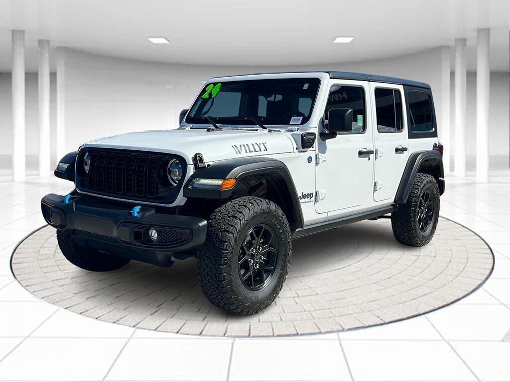 Recent Arrival! CARFAX One-Owner. Odometer is 3942 miles below market average! Bright White Clearcoat 2024 Jeep Wrangler Willys 4xe 4WD 8-Speed Automatic 2.0L I4 DOHC 2.0L I4 DOHC, 4-Wheel Disc Brakes, 4xe 4-Wheel Drive Swing Gate Decal, 7 & 4 Pin Wiring Harness, 8 Speakers, 97 MPH Vehicle Max Speed Calibration, ABS brakes, Air Conditioning, Alloy wheels, Apple CarPlay/Android Auto, Automatic temperature control, Auxiliary Switches, Black 3-Piece Hard Top, Black Grille, Brake assist, Cloth Low-Back Bucket Seats, Compass, Conventional Differential Front Axle, Delay-off headlights, Driver door bin, Driver vanity mirror, Dual front impact airbags, Dual front side impact airbags, E-Locker Rear Axle, Electronic Stability Control, Freedom Panel Storage Bag, Front anti-roll bar, Front Bucket Seats, Front Center Armrest w/Storage, Front dual zone A/C, Front fog lights, Front LED Fog Lamps, Front License Plate Bracket, Front reading lights, Fully automatic headlights, Heated door mirrors, Illuminated entry, Integrated roll-over protection, LED Premium Reflector Headlamps, Low tire pressure warning, Molded in Color Rubicon Highline Flare, MOPAR All-Weather Floor Mats, No Soft Top, Occupant sensing airbag, Off-Road Plus Mode, Outside temperature display, Overhead airbag, Panic alarm, ParkView Rear Back-Up Camera, Passenger door bin, Passenger vanity mirror, Power door mirrors, Power steering, Power windows, Quick Order Package 29W Willys, Radio data system, Radio: Uconnect 5 w/12.3" Display, Rear anti-roll bar, Rear reading lights, Rear Window Defroster, Rear Window Wiper/Washer, Remote keyless entry, Security system, Speed control, Split folding rear seat, Sport Suspension, Steering wheel mounted audio controls, Tachometer, Telescoping steering wheel, Tilt steering wheel, Traction control, Trip computer, Variably intermittent wipers, Voltmeter, Wheels: 17" x 7.5" Painted Black, Wheels: 20" x 8" Machined/Painted Gray, Willy's Suspension, Willys, Willys 4xe Hood Decal, 2.0L I4 DOHC. Clean CARFAX.