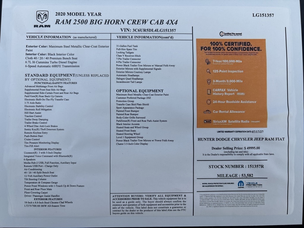 Odometer is 27119 miles below market average! Maximum Steel Metallic Clearcoat 2020 Ram 2500 Big Horn 4WD 6-Speed Automatic Cummins 6.7L I6 Turbodiesel 1-Year SiriusXM Guardian Trial, 2 Way Rear Headrest Seat, 220 Amp Alternator, 2nd Row In Floor Storage Bins, 3.73 Axle Ratio, 4 Way Front Headrests, 4-Wheel Disc Brakes, 40/20/40 Split Bench Seat, 5-Year SiriusXM Traffic Service, 5-Year SiriusXM Travel Link Service, 6 Speakers, 8.4" Touchscreen Display, 9 Alpine Speakers w/Subwoofer, ABS brakes, Active Noise Control System, Air Conditioning, Air Conditioning ATC w/Dual Zone Control, AM/FM radio, Anti-Spin Differential Rear Axle, Apple CarPlay, Auto-Dimming Rear-View Mirror, Black Interior Accents, Blind Spot & Cross Path Detection, Body Color Door Handles, Body Color Grille Surround, Brake assist, Bumpers: chrome, Center Hub, Center Stack Storage Drawer, Cloth 40/20/40 Bench Seat, Cluster 3.5" TFT Color Display, Compass, Delay-off headlights, Disassociated Touchscreen Display, Driver door bin, Dual front impact airbags, Dual front side impact airbags, Dual Glove Boxes, Electronic Stability Control, Electronically Controlled Throttle, Foam Bottle Insert (Door Trim Panel), Folding Flat Load Floor Storage, Footwell Courtesy Lamp, For Details Visit DriveUconnect.com, For More Info, Call 800-643-2112, Front & Rear Rubber Floor Mats, Front anti-roll bar, Front Armrest w/Cupholders, Front Center Armrest w/Storage, Front Center Seat Cushion Storage, Front Fog Lamps, Front reading lights, Front Seat Back Map Pockets, Fully automatic headlights, Glove Box Lamp, Google Android Auto, GPS Antenna Input, GPS Navigation, HD Radio, Heated door mirrors, Heated Front Seats, Heated Seats & Wheel Group, Heated Steering Wheel, Illuminated entry, Integrated Center Stack Radio, Integrated Voice Command w/Bluetooth, Leather Wrapped Steering Wheel, LED Bed Lighting, LED Tail Lamps, Level 1 Equipment Group, Locking Lower Glove Box, Low tire pressure warning, Manual Adjust 4-Way Driver Seat, Manual Adjust 4-Way Front Passenger Seat, Manufacturer's Statement of Origin, Occupant sensing airbag, Outside temperature display, Overhead airbag, Overhead console, Painted Front Bumper, Painted Rear Bumper, Panic alarm, ParkSense Front/Rear Park Assist System, ParkView Rear Back-Up Camera, Passenger door bin, Passenger vanity mirror, Power 2-Way Driver Lumbar Adjust, Power Adjust 8-Way Driver Seat, Power Adjust/Fold & Heated Black Tow Mirrors, Power Adjustable Pedals, Power door mirrors, Power Folding Mirrors, Power steering, Power windows, Premium Cloth 40/20/40 Bench Seat, Protection Group, Quick Order Package 2HZ Big Horn, Radio data system, Radio: Uconnect 3 w/5" Display, Radio: Uconnect 4 w/8.4" Display, Radio: Uconnect 4C Nav w/8.4" Display, Rear 60/40 Folding Seat, Rear anti-roll bar, Rear Dome w/On/Off Switch Lamp, Rear Folding Seat, Rear seat center armrest, Rear step bumper, Remote keyless entry, SiriusXM Radio Service, SiriusXM Satellite Radio, SiriusXM Traffic Plus, SiriusXM Travel Link, Speed control, Sport Appearance Package, Sport Decal, Steering Wheel Mounted Audio Controls, Sun Visors w/Illuminated Vanity Mirrors, Tachometer, Tilt steering wheel, Tip Start, Tow Hooks, Traction control, Trip computer, Turn signal indicator mirrors, Universal Garage Door Opener, USB Host Flip, Variably intermittent wipers, Vendor Painted Cargo Box Tracking, Voltmeter, Wheels: 18" x 8.0" Polished Aluminum, Wheels: 18" x 8.0" Steel Chrome Clad. Clean CARFAX.