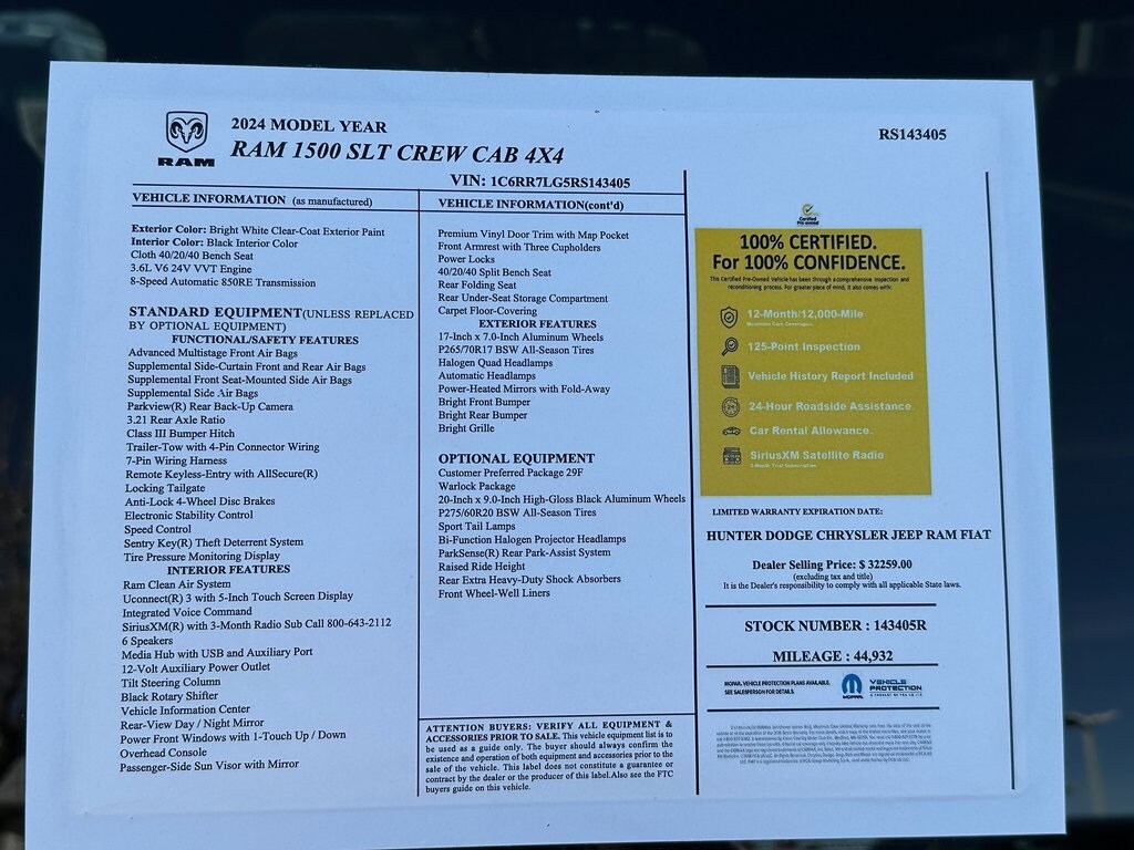 CARFAX One-Owner. Priced below KBB Fair Purchase Price! Bright White Clearcoat 2024 Ram 1500 Classic Warlock 4WD 8-Speed Automatic 3.6L V6 24V VVT 17" x 7" Aluminum Wheels, 3.21 Rear Axle Ratio, 4-Wheel Disc Brakes, 40/20/40 Split Bench Seat, 4x4 Flat Black Badge, 6 Speakers, ABS brakes, Active Grille Shutters, Air Conditioning, Alloy wheels, AM/FM radio: SiriusXM, Audio Input Jack for Mobile Devices, B-Pillar Black Out, Bi-Function Halogen Projector Headlamps, Black Exterior Mirrors, Black Exterior Truck Badging, Black Grille w/RAM Lettering, Black Headlamp Filler Panel, Black Powder Coated Front Bumper, Black Powder Coated Rear Bumper, Black RAM Head Tailgate Badge, Black Wheel Flares, Brake assist, Bumpers: chrome, Center Hub, Cloth 40/20/40 Bench Seat, Compass, Delay-off headlights, Driver door bin, Dual front impact airbags, Dual front side impact airbags, Electronic Shift, Electronic Stability Control, Exterior Mirrors w/Heating Element, Front anti-roll bar, Front Armrest w/3 Cupholders, Front Center Armrest w/Storage, Front License Plate Bracket, Front reading lights, Front wheel independent suspension, Front Wheel Well Liners, Fully automatic headlights, GPS Antenna Input, Heated door mirrors, Illuminated entry, Integrated Voice Command w/Bluetooth, Low tire pressure warning, Manufacturer's Statement of Origin, Occupant sensing airbag, Outside temperature display, Overhead airbag, Overhead console, Panic alarm, ParkSense Rear Park Assist System, ParkView Rear Back-Up Camera, Passenger door bin, Passenger vanity mirror, Power door mirrors, Power steering, Power windows, Quick Order Package 29F Warlock, Radio data system, Radio: Uconnect 3 w/5" Display, Raised Ride Height, Rear anti-roll bar, Rear Extra HD Shock Absorbers, Rear seat center armrest, Rear step bumper, Remote keyless entry, Remote USB Port, Remote USB Port - Charge Only, Semi-Gloss Black Hub, Speed control, Sport Tail Lamps, Storage Tray, Tachometer, Tilt steering wheel, Tip Start, Traction control, Trip computer, Variably intermittent wipers, Voltmeter, Warlock, Warlock Interior Accents, Wheels: 20" x 9" High Gloss Black Aluminum. Clean CARFAX.