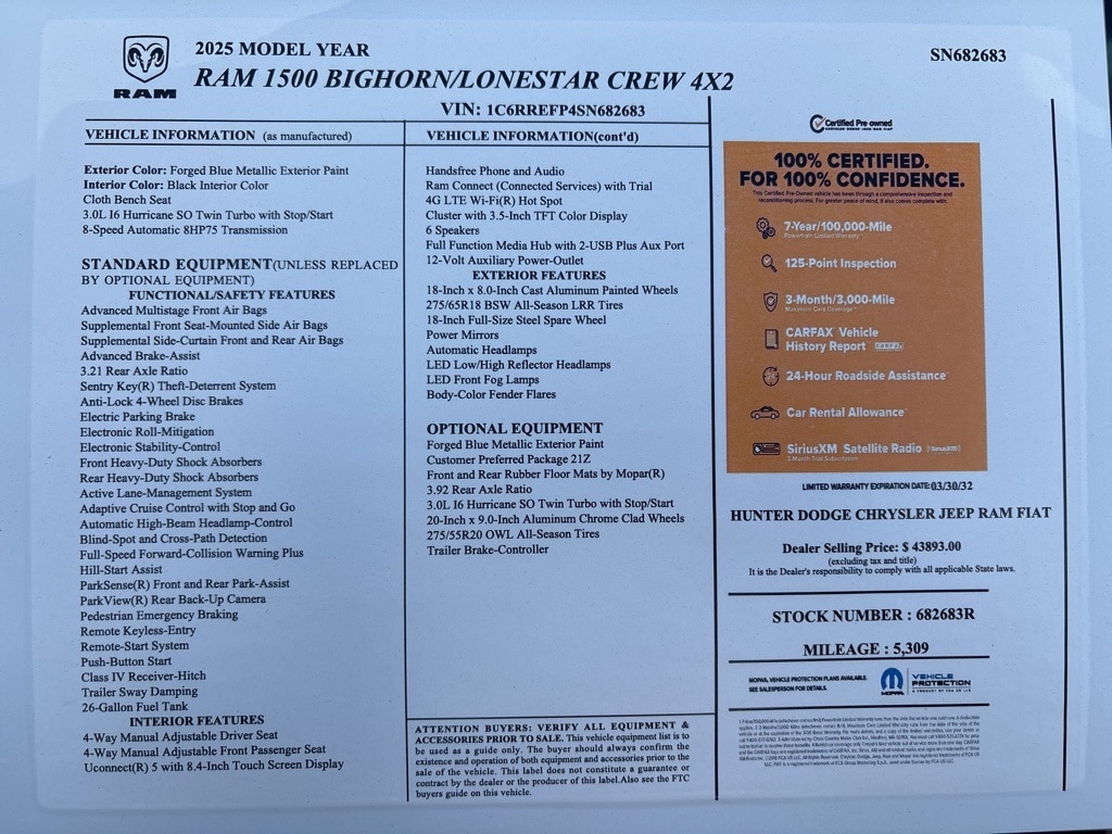 CARFAX One-Owner. Priced below KBB Fair Purchase Price! Odometer is 8475 miles below market average! Forged Blue Metallic 2025 Ram 1500 Big Horn/Lone Star RWD 8-Speed Automatic 3.0L I6 3 Rear Seat Head Restraints, 4 Way Front Headrests, 4-Wheel Disc Brakes, 4G LTE Wi-Fi Hot Spot, 6 Speakers, ABS brakes, Air Conditioning, Alloy wheels, AM/FM radio, Apple CarPlay, Apple CarPlay/Android Auto, Auto High-beam Headlights, Black Exterior Mirrors, Brake assist, Bumpers: chrome, Cloth Bench Seat, Compass, Connectivity - US/Canada, Convex Wide-Angle Exterior Mirror Insert, Delay-off headlights, Driver door bin, Dual front impact airbags, Dual front side impact airbags, Electronic Stability Control, Exterior Mirrors w/Heating Element, Exterior Parking Camera Rear, Front anti-roll bar, Front Center Armrest w/Storage, Front fog lights, Front License Plate Bracket, Front reading lights, Front Seat Back Map Pockets, Front wheel independent suspension, Fully automatic headlights, Google Android Auto, GPS Antenna Input, Heated door mirrors, Illuminated entry, Low tire pressure warning, Manual Adjust 4-Way Front Passenger Seat, Manual Folding Exterior Mirrors, Manufacturer's Statement of Origin, MOPAR Front & Rear Rubber Floor Mats, Occupant sensing airbag, Outside temperature display, Overhead airbag, Overhead console, Panic alarm, Passenger door bin, Passenger vanity mirror, Power door mirrors, Power steering, Power windows, Quick Order Package 21Z Big Horn, Radio data system, Radio: Uconnect 5 W w/8.4" Display, RAM Grille Badge - Chrome, Rear 60/40 Folding Seat, Rear anti-roll bar, Rear Center Armrest, Rear seat center armrest, Rear step bumper, Remote keyless entry, Speed control, Split folding rear seat, Supplier Part Tracking (J-1), Tachometer, Telescoping steering wheel, Tilt steering wheel, Traction control, Trailer Brake Control, Trip computer, USB Host Flip, Variably intermittent wipers, Voltmeter, Wheels: 18" x 8" Cast-Aluminum Painted, Wheels: 20" x 9" Aluminum Chrome Clad (WRK). Clean CARFAX.