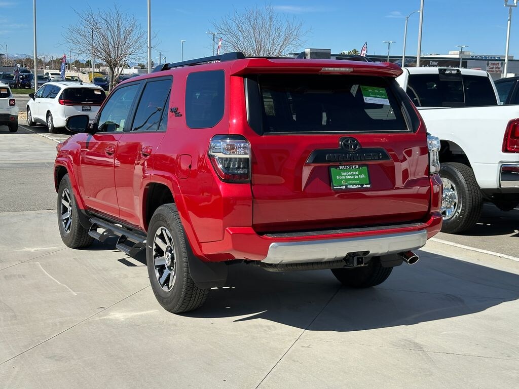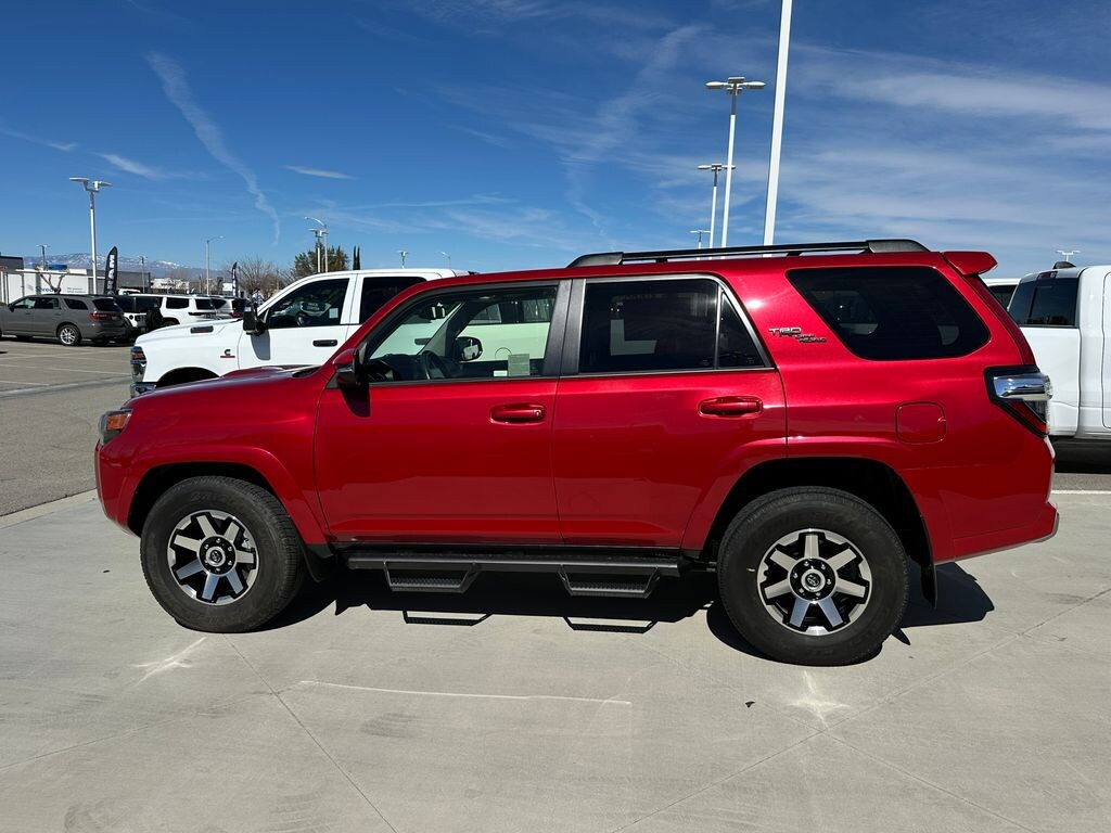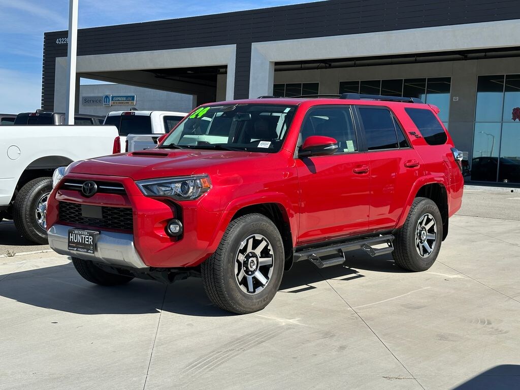 Recent Arrival! CARFAX One-Owner. Odometer is 7395 miles below market average! Barcelona Red Metallic 2024 Toyota 4Runner TRD Off-Road Premium 4WD 5-Speed with ECT 4.0L V6 DOHC 24V 4WD, Graphite Artificial Leather, 3.727 Axle Ratio, 4-Wheel Disc Brakes, 8 Speakers, ABS brakes, Air Conditioning, All Weather Floor Liner & Cargo Tray (TMS), Alloy wheels, AM/FM radio: SiriusXM, Anti-whiplash front head restraints, Apple CarPlay/Android Auto, Auto High-beam Headlights, Auto-dimming Rear-View mirror, Black Roof Rails, Blackout Emblem Overlays (TMS), Brake assist, Bumpers: body-color, Cargo Cover (TMS), Compass, Door Edge Guard (TMS), Driver door bin, Driver vanity mirror, Dual front impact airbags, Dual front side impact airbags, Electronic Stability Control, Emergency communication system: Safety Connect (1-year trial), Exhaust Tip (TMS), Exterior Parking Camera Rear, Front anti-roll bar, Front Bucket Seats, Front Center Armrest, Front fog lights, Front reading lights, Front wheel independent suspension, Garage Door Opener, Garage door transmitter: HomeLink, Heated door mirrors, Heated Front Bucket Seats, Heated front seats, Heated Outside Rear-View Mirrors, Heated steering wheel, Illuminated entry, Kinetic Dynamic Suspension System (KDSS), Knee airbag, Leather Shift Knob, Low tire pressure warning, Moonroof Package, Moonroof w/Tilt Up & Slide, Navigation System, Occupant sensing airbag, Off Road Package, Off Road Premium Package, Outside temperature display, Overhead airbag, Overhead console, Panic alarm, Passenger door bin, Passenger vanity mirror, Power door mirrors, Power driver seat, Power passenger seat, Power steering, Power windows, Predator Tube Step (TMS), Quick Charge Cable (TMS), Radio: Premium Audio, Rear anti-roll bar, Rear seat center armrest, Rear window defroster, Rear window wiper, Remote keyless entry, Roof Rack Cross Bars (TMS), Security system, SofTex Seat Trim, Speed control, Speed-sensing steering, Split folding rear seat, Spoiler, Steering wheel mounted audio controls, Tachometer, Telescoping steering wheel, Tilt steering wheel, Traction control, Trip computer, Turn signal indicator mirrors, Variably intermittent wipers, Wheels: 17" Unique 7-Spoke Off-Road Alloy, 4WD, Graphite Artificial Leather.