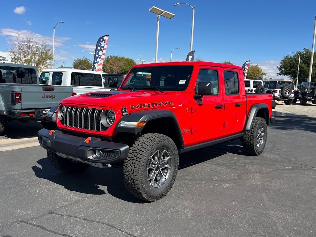 Firecracker Red Clearcoat 2025 Jeep Gladiator Mojave 4WD 8-Speed Automatic 3.6L V6 24V VVT 12.3" Touchscreen Display, 4-Wheel Disc Brakes, 4.10 Rear Axle Ratio, 4G LTE Wi-Fi Hot Spot, 8 Speakers, 97 MPH Vehicle Max Speed Calibration, ABS brakes, Air Conditioning, Alexa Built-In, Alloy wheels, Alpine Premium Audio System, AM/FM radio: SiriusXM, Apple CarPlay, Apple CarPlay/Android Auto, Automatic temperature control, Body Color 3-Piece Hard Top, Brake assist, Compass, Connectivity - US/Canada, Delay-off headlights, Driver door bin, Driver vanity mirror, Dual front impact airbags, Dual front side impact airbags, Electronic Stability Control, Emergency communication system: Jeep Connect, Freedom Panel Storage Bag, Front anti-roll bar, Front Bucket Seats, Front Center Armrest w/Storage, Front dual zone A/C, Front fog lights, Front License Plate Bracket, Front reading lights, Fully automatic headlights, Google Android Auto, Heated door mirrors, Heavy Duty Suspension w/Gas Shocks, Illuminated entry, Integrated roll-over protection, Low tire pressure warning, MOPAR Black Hood Graphic, No Soft Top, Occupant sensing airbag, Outside temperature display, Overhead airbag, Panic alarm, Passenger door bin, Passenger vanity mirror, Power door mirrors, Power steering, Power windows, Premium Cloth Seats w/Sport Bolsters, Quick Order Package 24D Mojave, Radio data system, Radio: Uconnect 5 w/12.3" Display, Rear anti-roll bar, Rear reading lights, Rear Sliding Window, Rear Window Defroster, Remote keyless entry, Security system, Speed control, Split folding rear seat, Steering wheel mounted audio controls, Tachometer, Telescoping steering wheel, Tilt steering wheel, Traction control, Trip computer, USB Host Flip, Variably intermittent wipers, Voltmeter, Wheels: 17" x 7.5" Dark Gray Painted, Wheels: 17" x 7.5" Machined/Painted Dark Gray. Price includes: $5500 - 2025 National Bonus Cash . Exp. 11/03/2025