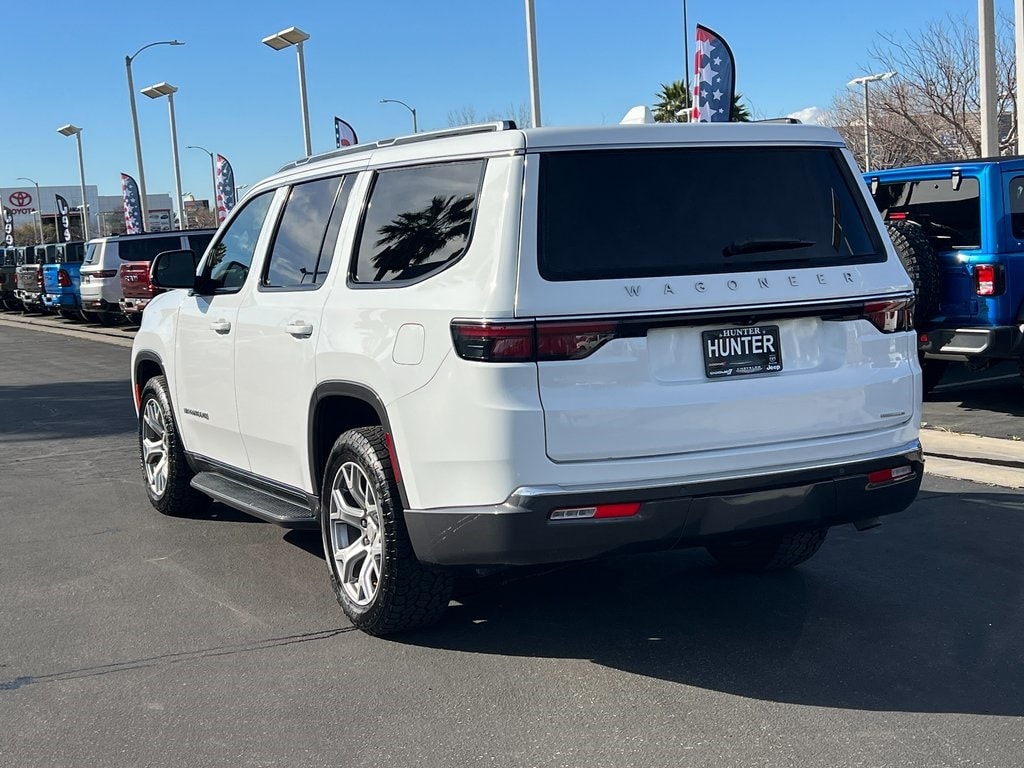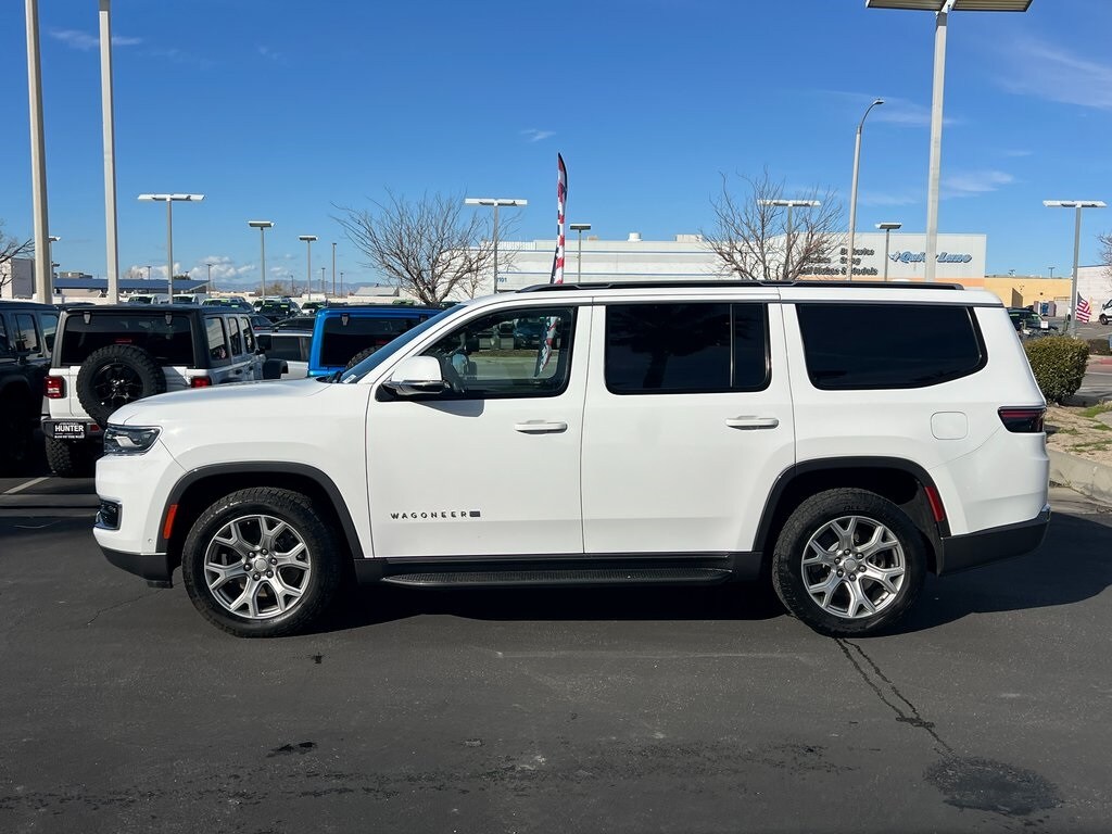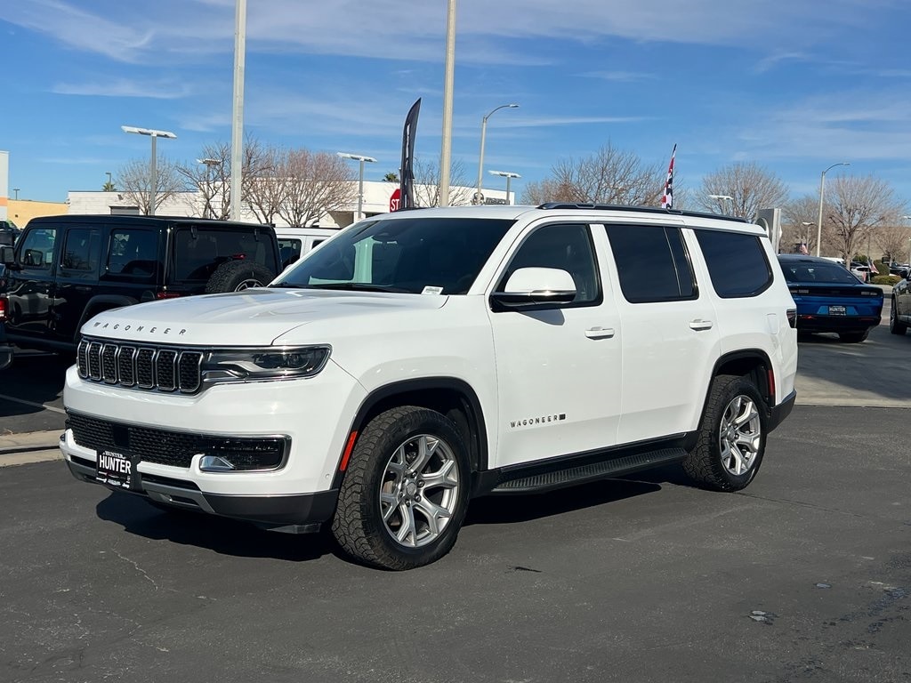 CARFAX One-Owner. Bright White Clearcoat 2022 Jeep Wagoneer Series II RWD 8-Speed Automatic 5.7L V8 10 Speakers, 3.21 Rear Axle Ratio, 3rd row seats: bench, 4-Wheel Disc Brakes, ABS brakes, Adjustable pedals, Air Conditioning, Alloy wheels, AM/FM radio: SiriusXM with 360L, Anti-whiplash front head restraints, Audio memory, Auto-dimming door mirrors, Auto-dimming Rear-View mirror, Auto-leveling suspension, Automatic temperature control, Brake assist, Bumpers: body-color, Compass, Delay-off headlights, Driver door bin, Driver vanity mirror, Driver's Seat Mounted Armrest, Dual front impact airbags, Dual front side impact airbags, Electronic Stability Control, Exterior Parking Camera Rear, Four wheel independent suspension, Front anti-roll bar, Front Bucket Seats, Front Center Armrest w/Storage, Front dual zone A/C, Front fog lights, Front reading lights, Fully automatic headlights, Garage door transmitter, Genuine wood console insert, Genuine wood dashboard insert, Genuine wood door panel insert, Heated door mirrors, Heated front seats, Heated steering wheel, Illuminated entry, Knee airbag, Leather Trimmed Bucket Seats, Low tire pressure warning, Memory seat, Navigation System, Normal Duty Suspension, Occupant sensing airbag, Outside temperature display, Overhead airbag, Overhead console, Panic alarm, Passenger door bin, Passenger seat mounted armrest, Passenger vanity mirror, Pedal memory, Power adjustable front head restraints, Power door mirrors, Power driver seat, Power Liftgate, Power passenger seat, Power steering, Power windows, Quick Order Package 22J, Radio data system, Radio: Uconnect 5 Nav w/10.1" Display, Rain sensing wipers, Rear air conditioning, Rear anti-roll bar, Rear dual zone A/C, Rear reading lights, Rear seat center armrest, Rear window defroster, Rear window wiper, Reclining 3rd row seat, Remote keyless entry, Security system, Speed control, Speed-sensing steering, Speed-Sensitive Wipers, Split folding rear seat, Steering wheel memory, Steering wheel mounted audio controls, Tachometer, Telescoping steering wheel, Tilt steering wheel, Traction control, Trip computer, Turn signal indicator mirrors, Variably intermittent wipers, Ventilated front seats, Voltmeter, Wheels: 20" x 9.0" Aluminum Base Finish.