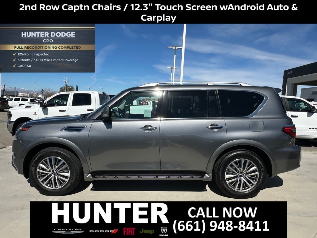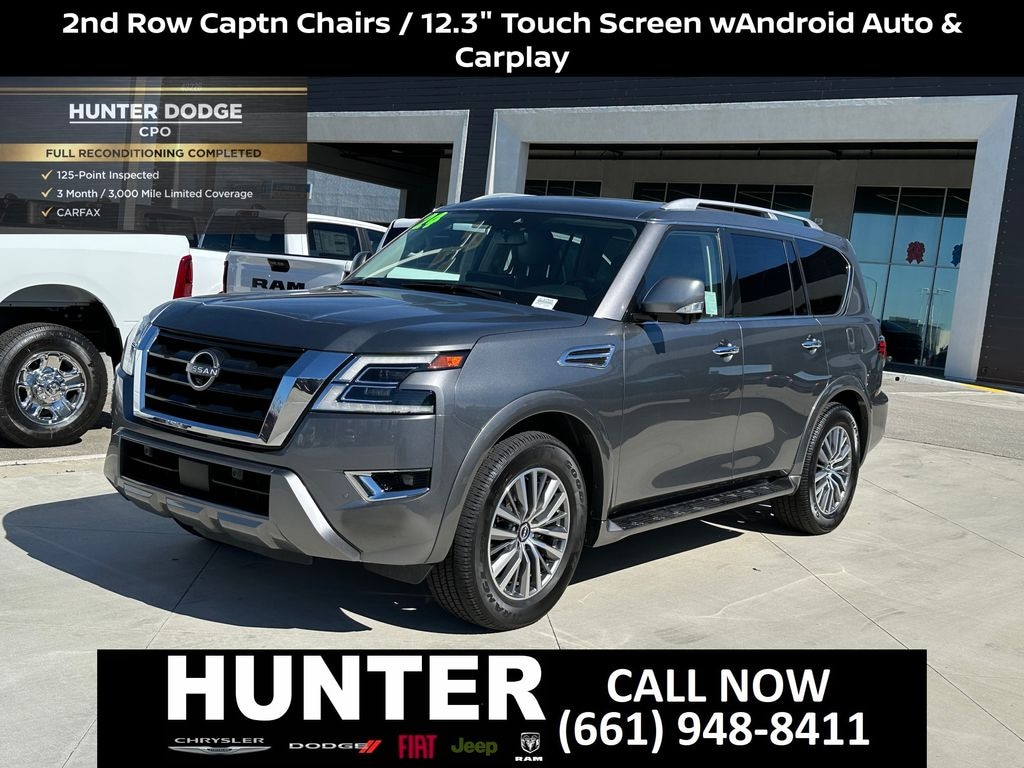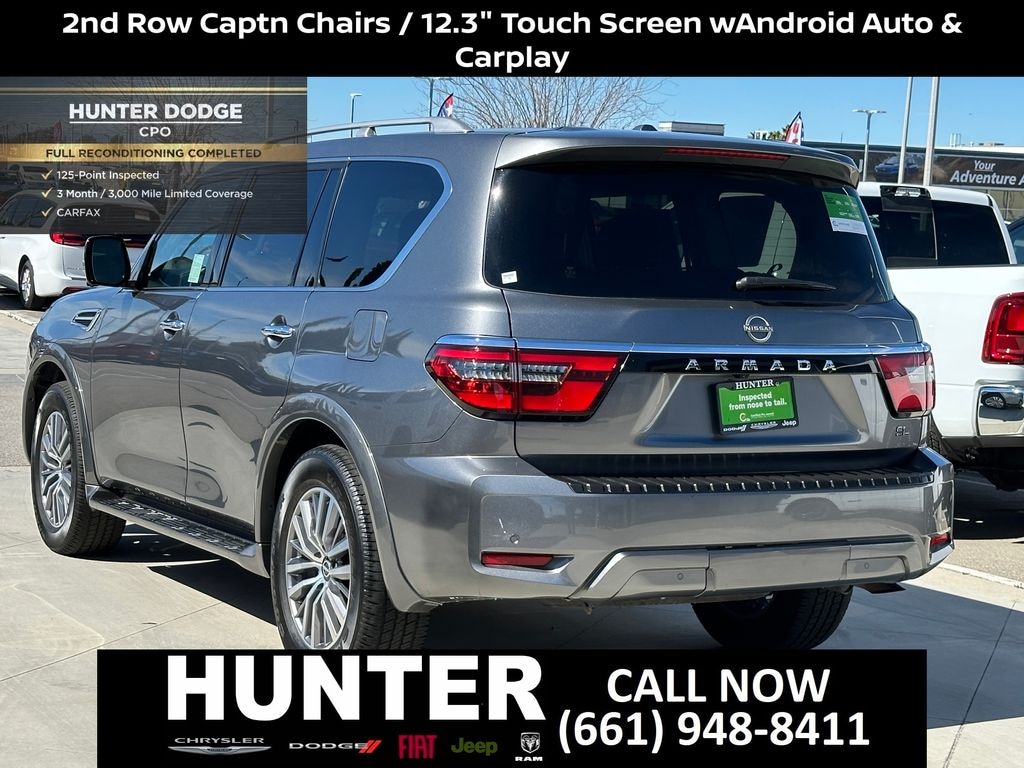 Certified. Certification Program Details: 3 Month/3,000 Mile Extended Care Premium Limited Warranty $500 Trip Interruption Coverage $100 "Sign-and-Go" Roadside Assistance $45/Day Car Rental or Taxi Allowance 3-Month Free Trial Connected Services CARFAX Vehicle History Report CARFAX One-Owner. Priced below KBB Fair Purchase Price! Gun Metallic 2024 Nissan Armada SL RWD 7-Speed Automatic 5.6L V8 DOHC 32V LEV3-ULEV125 400hp GO Certified (Non OEM) Certified, 13 Speakers, 2.937 Axle Ratio, 2nd Row Captain's Chairs, 2nd Row Center Console w/Padded Armrest, 3rd Row Carpeted Floor Mats - Captain Seat, 3rd row seats: split-bench, 4-Wheel Disc Brakes, ABS brakes, Air Conditioning, Alloy wheels, AM/FM radio: SiriusXM, Anti-whiplash front head restraints, Auto High-beam Headlights, Auto tilt-away steering wheel, Auto-dimming door mirrors, Auto-dimming Rear-View mirror, Auto-leveling suspension, Automatic temperature control, Brake assist, Bumpers: body-color, Captain's Chairs Package, Delay-off headlights, Driver door bin, Driver vanity mirror, Dual front impact airbags, Dual front side impact airbags, Electronic Stability Control, Emergency communication system: NissanConnect Services, Exterior Parking Camera Rear, Four wheel independent suspension, Front anti-roll bar, Front Bucket Seats, Front Center Armrest, Front dual zone A/C, Front fog lights, Front reading lights, Fully automatic headlights, Garage door transmitter: HomeLink, Heated door mirrors, Heated Front Bucket Seats, Heated front seats, Heated steering wheel, HVAC memory, Illuminated entry, Knee airbag, Leather Shift Knob, Leather steering wheel, Leather-Appointed Seat Trim, Low tire pressure warning, Memory seat, Navigation System, Occupant sensing airbag, Outside temperature display, Overhead airbag, Overhead console, Panic alarm, Passenger door bin, Passenger vanity mirror, Power door mirrors, Power driver seat, Power Liftgate, Power moonroof, Power passenger seat, Power steering, Power windows, Radio: NissanConnect w/SiriusXM, Rear air conditioning, Rear anti-roll bar, Rear reading lights, Rear seat center armrest, Rear window defroster, Rear window wiper, Reclining 3rd row seat, Remote keyless entry, Security system, Speed control, Speed-sensing steering, Speed-Sensitive Wipers, Split folding rear seat, Spoiler, Steering wheel memory, Steering wheel mounted audio controls, Tachometer, Telescoping steering wheel, Tilt steering wheel, Traction control, Trip computer, Turn signal indicator mirrors, Variably intermittent wipers, Voltmeter, Wheels: 20" x 8J Painted Alloy.
